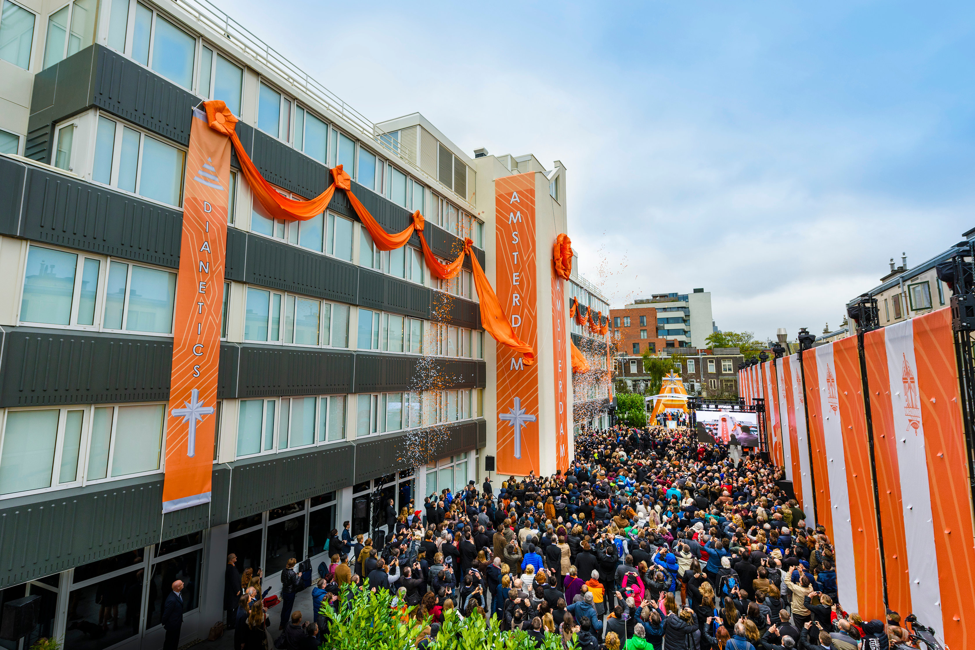 Bandiere che sventolano e Scientologist, ospiti e dignitari acclamano ed elogiano la trasformazione di una nuova Chiesa di Scientology nel centro del quartiere storico di Amburgo.