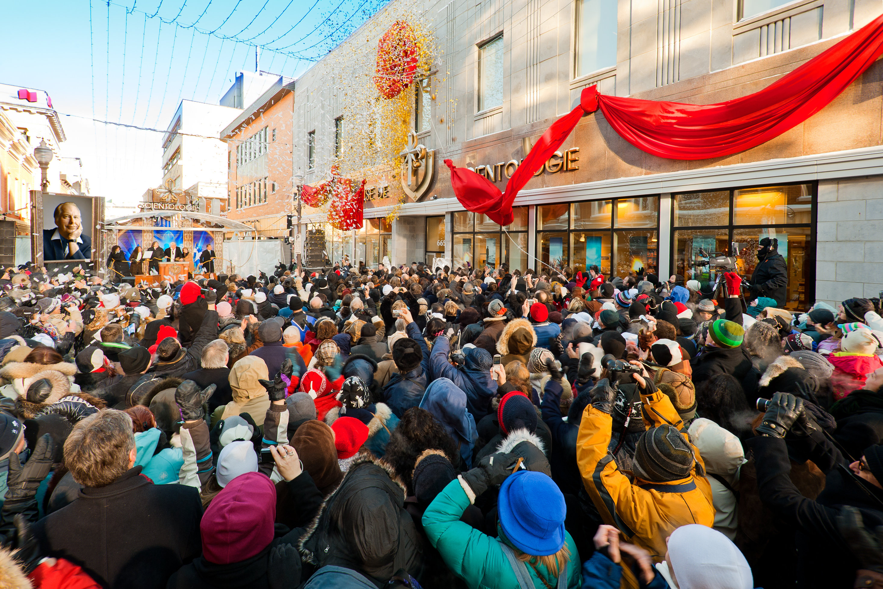In mezzo a un’esplosione di coriandoli e a una nuvola di palloncini, più di 4.000 persone trionfanti applaudono non appena il nastro inaugurale cade per la prima Chiesa di Scientology a Taiwan.