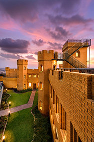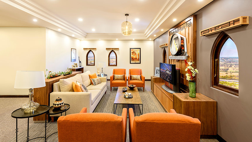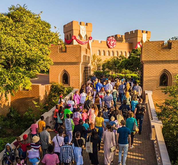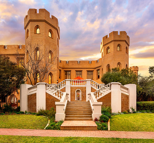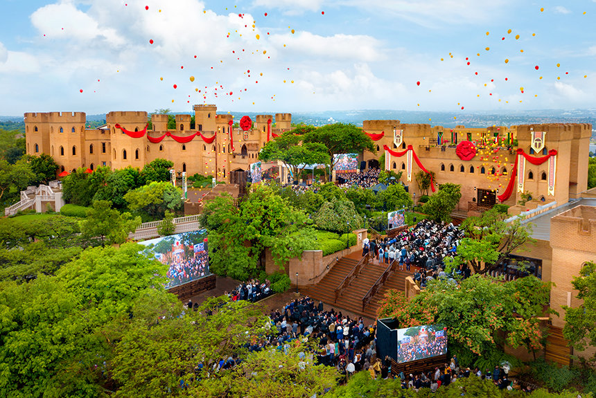 Al centro di questa magnifica collina, il Castello di Kyalami di 8.000 metri quadri, circondato da una proprietà di 9 ettari, si erge a testimoniare l’impegno della religione ad aiutare a creare un’Africa in grado di soddisfare il suo illimitato potenziale. L’aspetto del Castello, che guarda i gemelli giganti nazionali di Gauteng: Johannesburg a sud e Pretoria a nord, riflette la magica aura del paesaggio sudafricano. Il panorama conquista subito i visitatori, e le 12 torrette merlate del Castello e le mura dello spessore di 20 centimetri gli trasmettono un’atmosfera unica. Gli eleganti interni, arricchiti da pavimenti in marmo italiano, estratto dalla stessa cava da cui proveniva il marmo usato da Michelangelo, hanno fornito un’atmosfera speciale alla spettacolare inaugurazione.