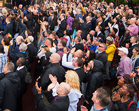 In onore di tale straordinario futuro, un centinaio di coristi che indossavano abiti africani tradizionali, hanno riempito il Castello dalla piattaforma al parapetto, ballando e cantando “Venti di Cambiamento”, brano originale arrangiato appositamente per l’occasione. Ispirata a L. Ron Hubbard e al suo sogno di un’illimitata libertà spirituale per l’Africa, l’esibizione ha conquistato il cuore di tutti i presenti. Dignitari in rappresentanza della polizia sudafricana e del governo si sono uniti al coro, concordi nell’acclamare l’occasione storica come un “nuovo risveglio per la nostra amata Africa”.
