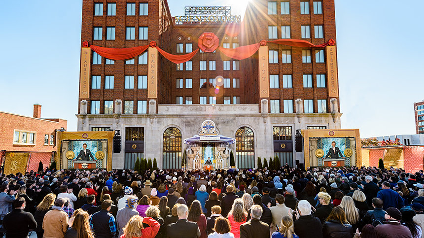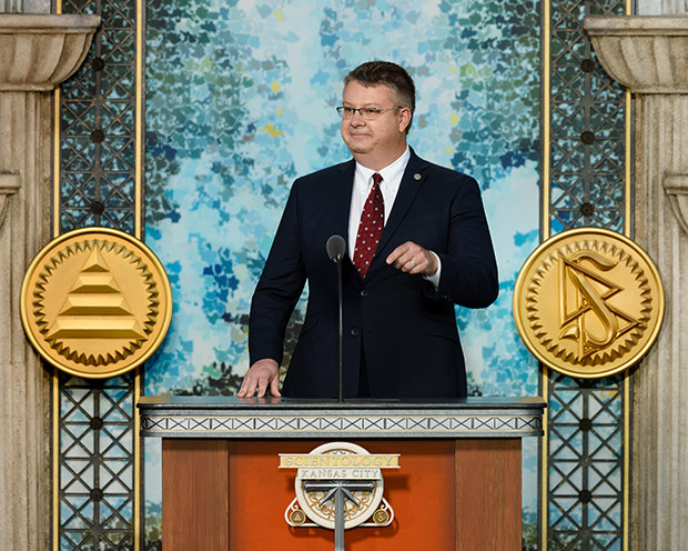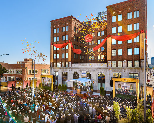 Jeff Owens, il Vice Presidente del distretto artistico di Crossroads, ha reso omaggio al lavoro della Chiesa per ripristinare la sua nuova dimora nel cuore del distretto: “È vero, la vostra dimora sorge proprio nel centro del distretto artistico di Crossroads. Ma voi non avete dato per scontata questa particolarità, siete entrati in azione. Quando siete venuti a ristrutturare questo prezioso patrimonio storico, avete affermato: ‘L’arte non ha limiti, faremo di questo luogo un capolavoro, proprio qui, in questo punto’. Beh, sono rimasto semplicemente sbalordito osservando la vostra sontuosa entrata e vedendo ciò che avete fatto. È una bellissima preservazione della classica Kansas City. Vale a dire, la vostra casa riflette la personalità della nostra casa come comunità”.