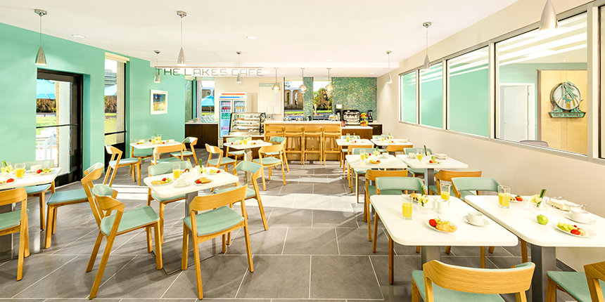 L’elegante Lakes Café, con posti a sedere sia all’interno che all’esterno, offre un luogo d’incontro alle persone che partecipano ai vari eventi, come pure ai fedeli durante gli intervalli dei servizi di Scientology.