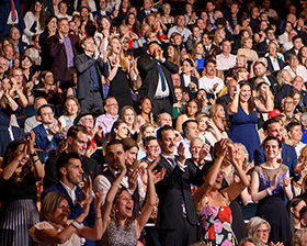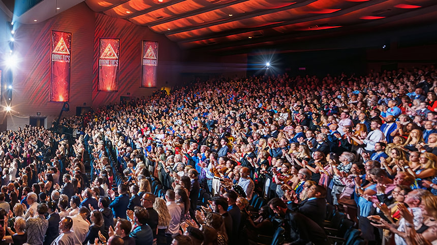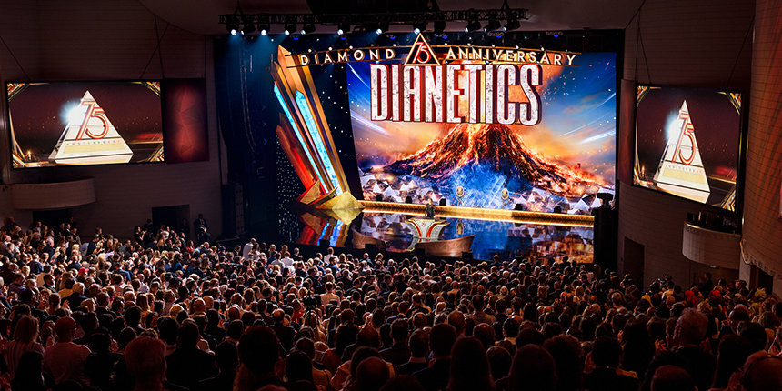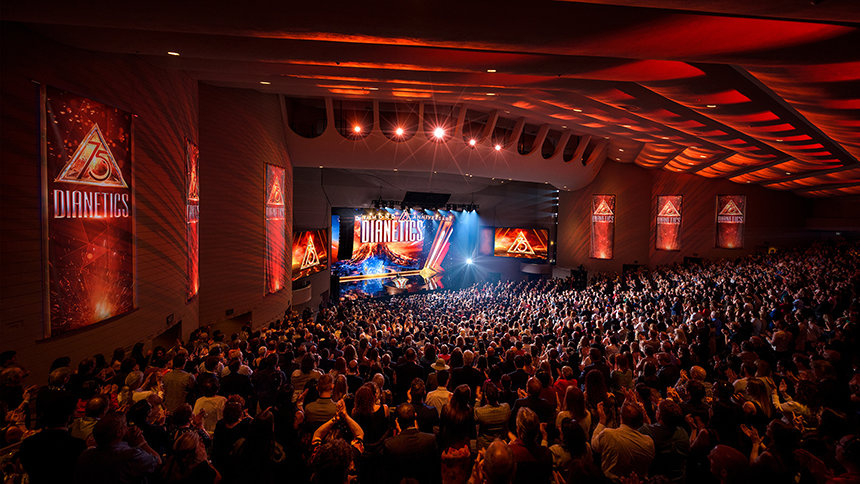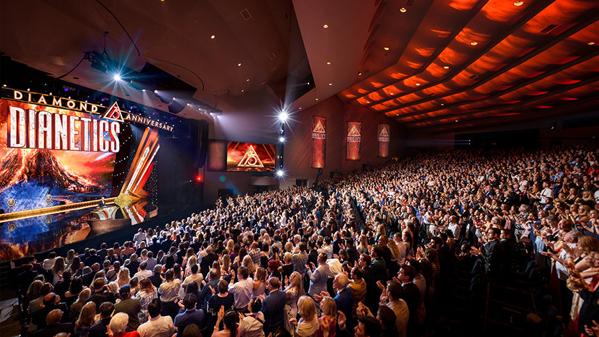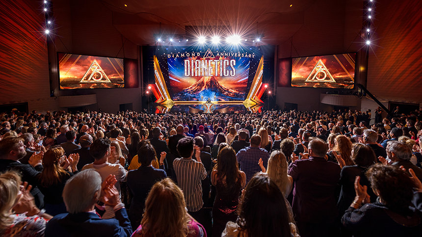 La folla è scoppiata in una lunga e spontanea standing ovation all’apparizione di David Miscavige, il leader ecclesiastico della religione di Scientology. “Esattamente 75 anni fa, un libro chiamato Dianetics scatenò una forza sismica che scosse il globo. E celebrando stasera, non stiamo facendo altro che onorare la forza più potente della Terra, una forza per la sanità mentale e la sopravvivenza.