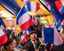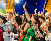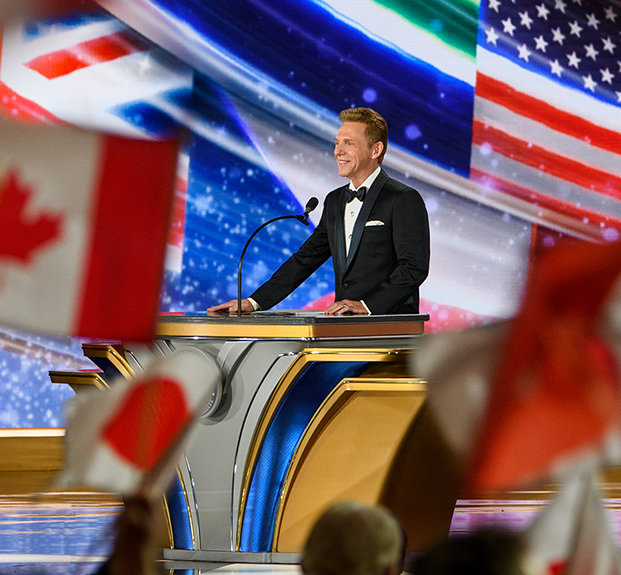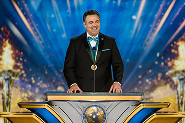 David Miscavige dà il benvenuto agli Scientologist e agli ospiti a una serata illuminata dai colori e dal trionfo, mentre le bandiere sventolano, gli animi si elevano e la folla si alza in piedi in segno di gioia.