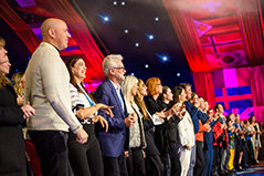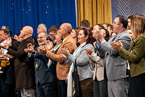 I membri della IAS e gli ospiti si alzano in piedi per dare riconoscimento all’impegno svolto dai Ministri Volontari di Scientology nel salvare vite e trasformare esistenze nel corso dell’ultimo anno.
