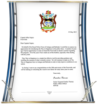 - La Commissione della Polizia Reale di Antigua, in riconoscimento dei quasi 250 poliziotti ora istruiti sulla Via della Felicità, che promettono di mettere in pratica questi precetti per “migliorare la [loro] nazione insulare”.