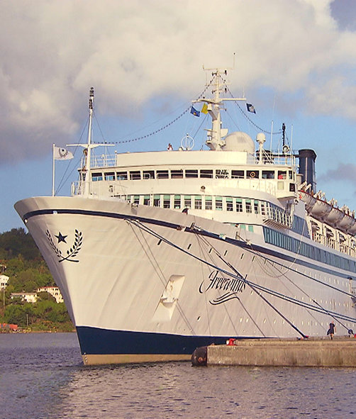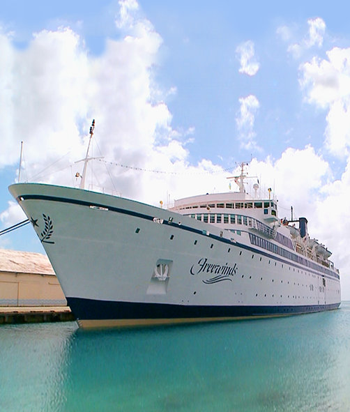 Per i Caraibi, allegri saluti di navi da crociera e il trasporto marittimo di turisti sono comuni, ma quella non è una nave di piacere, né i partecipanti sono riuniti per puro e semplice divertimento, anche se certamente si divertono. Anche se la nave, la Motonave Freewinds, assomiglia ad una nave da crociera – linee classiche, eleganti cabine private e la cucina di prima classe di un transatlantico – è un ritiro religioso per la Chiesa di Scientology.