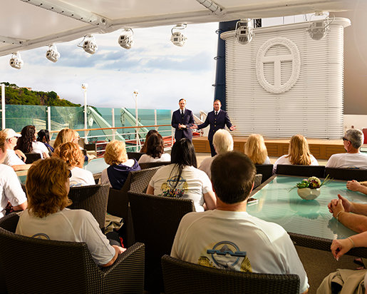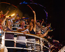 Gli ospiti hanno iniziato ad arrivare, venerdì 15 giugno, al porto di scalo di Bridgetown, nelle Barbados, dove erano attesi dallo scintillante vascello bianco a nove ponti e di 135 metri. Alle 18:00 del pomeriggio seguente, più di 250 tra gli Scientologist più dediti del mondo erano sul molo o già a bordo, appoggiati alle ringhiere, nella brezza dell’isola. L’atmosfera era colma di aspettativa mentre il suono dei tamburi della Royal Barbados Police Band fendeva l’aria balsamica e le autorità locali salutavano tutti con un affettuoso arrivederci. E mentre la prua della Freewinds si staccava dal molo sulla rotta del mare aperto, uno spettacolo pirotecnico in onore del suo trentesimo anniversario illuminava il cielo di Bridgetown.