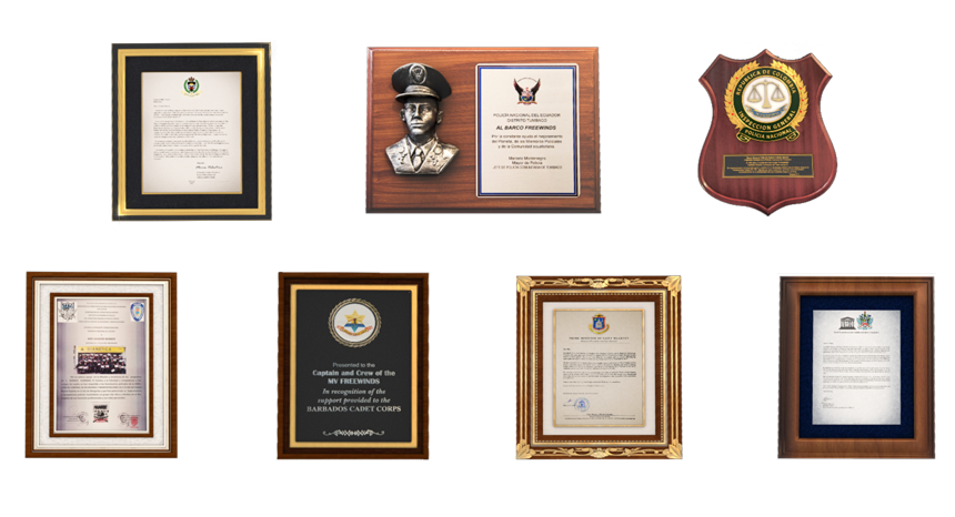 Ad oggi, gli infiniti impegni di beneficenza della Freewinds le hanno valso oltre 450 premi, riconoscimenti e sentiti proclami da tutti i suoi amici caraibici, tra cui quelli di ciascuna delle isole e dei porti che frequenta: Antigua, Dominica, St. Martin, St. Kitts, Tortola , Virgin Gorda, St. Vincent, Barbados, Grenada, Aruba, Bonaire, Curaçao, Freeport e Nassau.