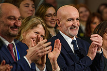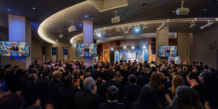Ma le ovazioni più fragorose, sia all’interno che all’esterno su tutti i terreni dell’edificio – dove migliaia di persone assistevano all’evento su schermi giganti allestiti negli spaziosi padiglioni che ospitavano la straripante folla – erano per David Miscavige, Presidente del Consiglio di Amministrazione del Religious Technology Center, mentre inaugurava questo nuovo spettacolare centro.