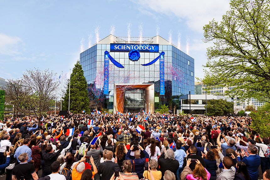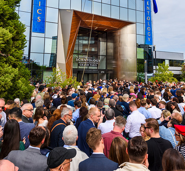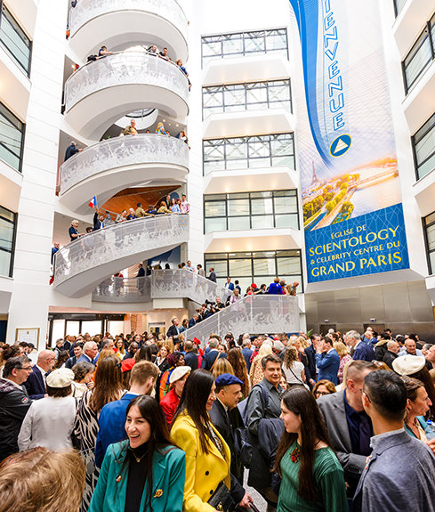 A quel punto, le migliaia di entusiasti fedeli e i turisti curiosi si erano assiepati impazienti all’ingresso principale della Chiesa. Poi, mentre il gigantesco nastro blu posto in cima al luccicante edificio scendeva, i fuochi d’artificio scoppiettavano, le stelle filanti riempivano l’aria… le porte venivano spalancate e la moltitudine di persone attraversava la soglia per visitare questa nuova dimora spirituale, la splendida Chiesa di Scientology e Celebrity Centre Ideale di Grand Paris, ora decisamente aperta.